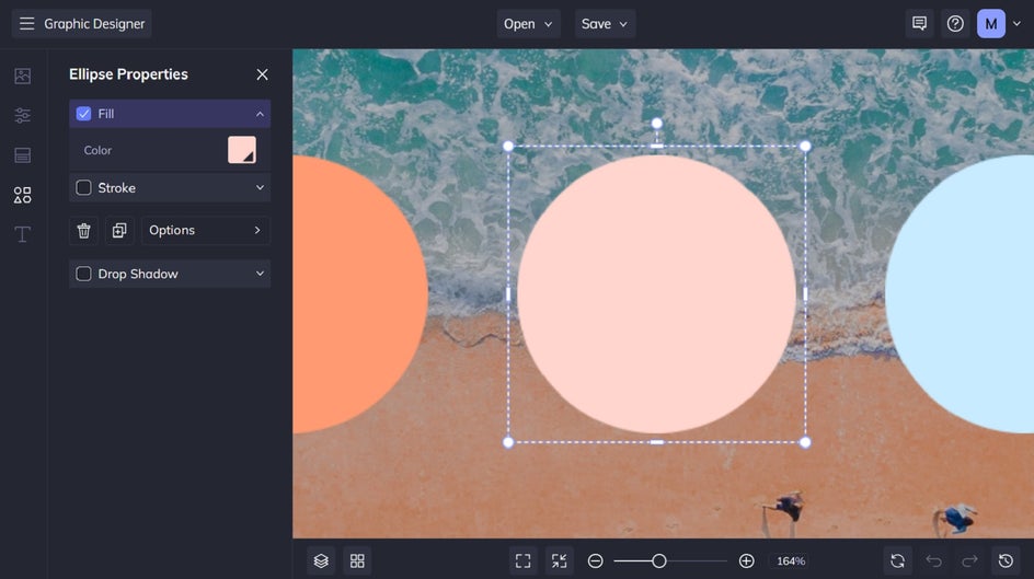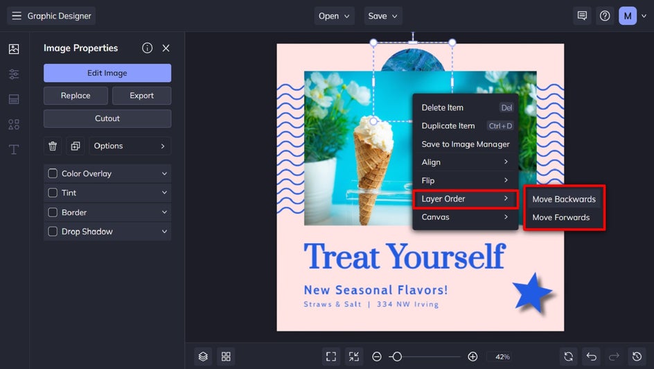 Whether you’re adding Basic Shapes to a photo, collage, or graphic design, our layering options are perfect for creating a sense of visual hierarchy and depth. All you need to do is place your shape onto your canvas. Then, right-click it and select Layer Order > Move Backwards or Move Forwards. This lets you place your shape behind or in front of other elements, such as text, photos, graphics, or even other shapes, thus creating the perfect layered look.