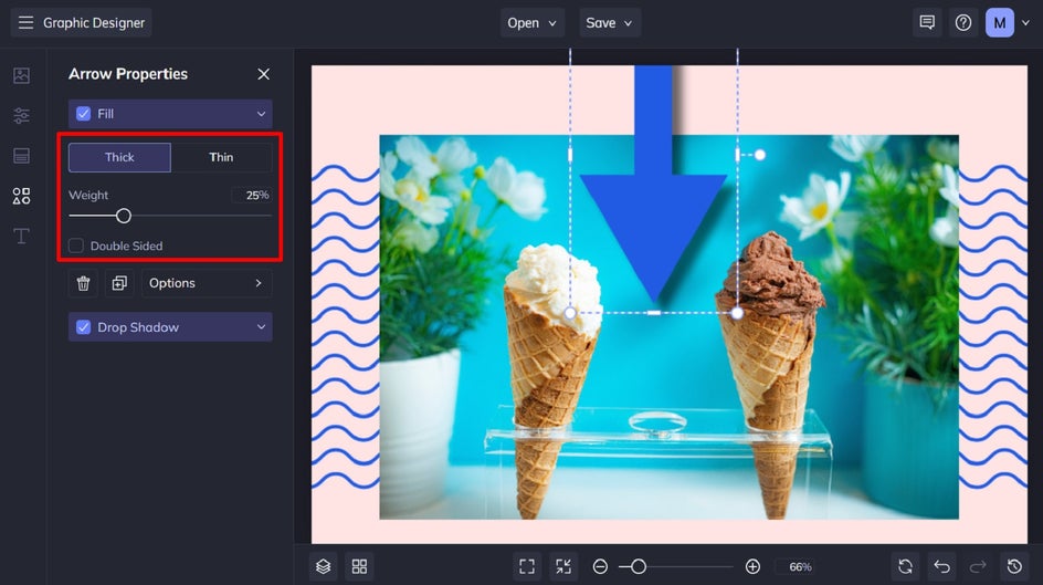 Finally, the Arrow Properties panel allows you to choose a Thick or Thin arrow, as well as to increase or decrease the Weight of the lined portion of the arrow with the corresponding slider. You can even choose to make it double-sided by checking the box!