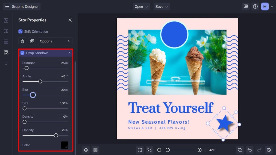 You can also add a Drop Shadow to your shapes to give them a three-dimensional look that allows them to stand out among your design. When you select Drop Shadow, you also have the chance to customize numerous aspects of this effect, including its distance, angle, blur, size, density, opacity, and color. This means your Drop Shadow can be as solid or as softly focused as you’d like. You can even follow this tutorial to create a glowing effect around your shape.