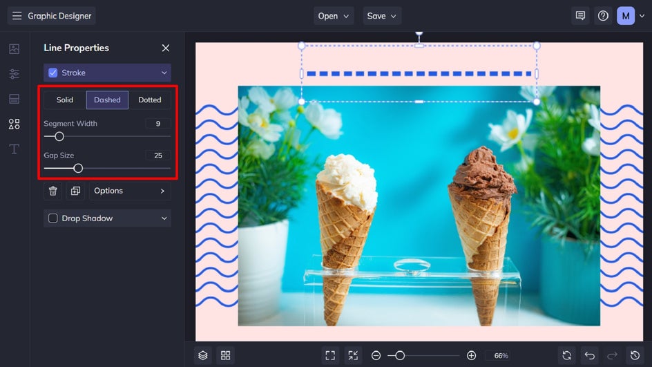 The Line Properties panel allows you to choose three different styles of lines: Solid, Dashed, and Dotted. Depending on your line style, you’ll be able to control the width of each segment with the Segment Width slider, and the size of the gaps between segments with the Gap Size slider.