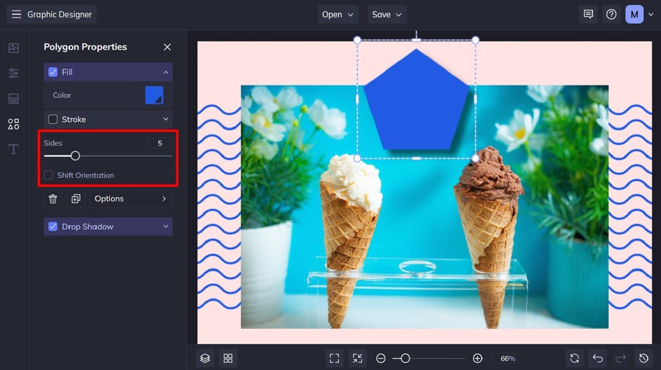 In the Polygon Properties panel, you can change the number of Sides in your shape from 3 sides to 12 sides, so you always get the perfect polygon with just one slider adjustment.