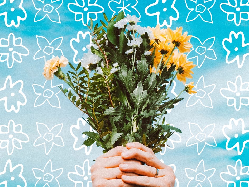 In this example below, we wanted to enhance a photo of a bouquet of flowers with a floral pattern, thus adding even more to its springtime vibe. Not only did we use the duplicate method described above, but we also used the Remove Background feature to separate the bouquet from the sky. This allowed us to place it over our graphic pattern, creating a layered effect.