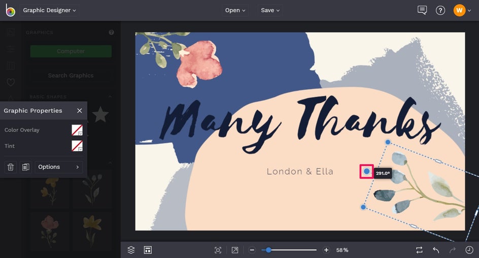 You can make your graphic smaller or larger by clicking on it and dragging its corners inwards or outwards. Additionally, you can rotate your image by clicking on the outermost circle and dragging it around with your mouse.