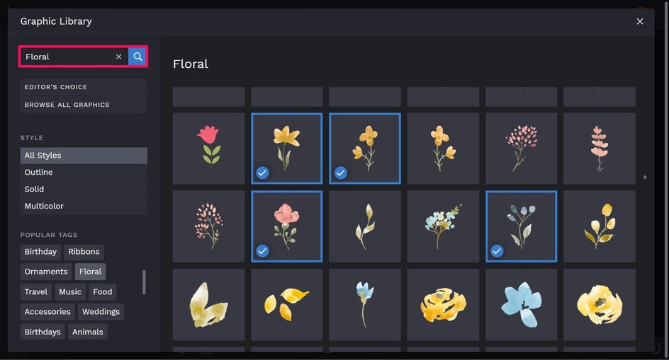 To use graphics in your design, just click the ones which take your fancy. They will then have a blue checkmark icon appear in their bottom-left corner. Once you’re done selecting graphics, just click the ‘x’ icon on the top-right of the screen to exit the Graphic Library.