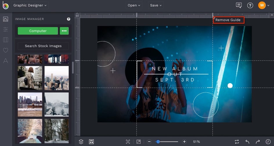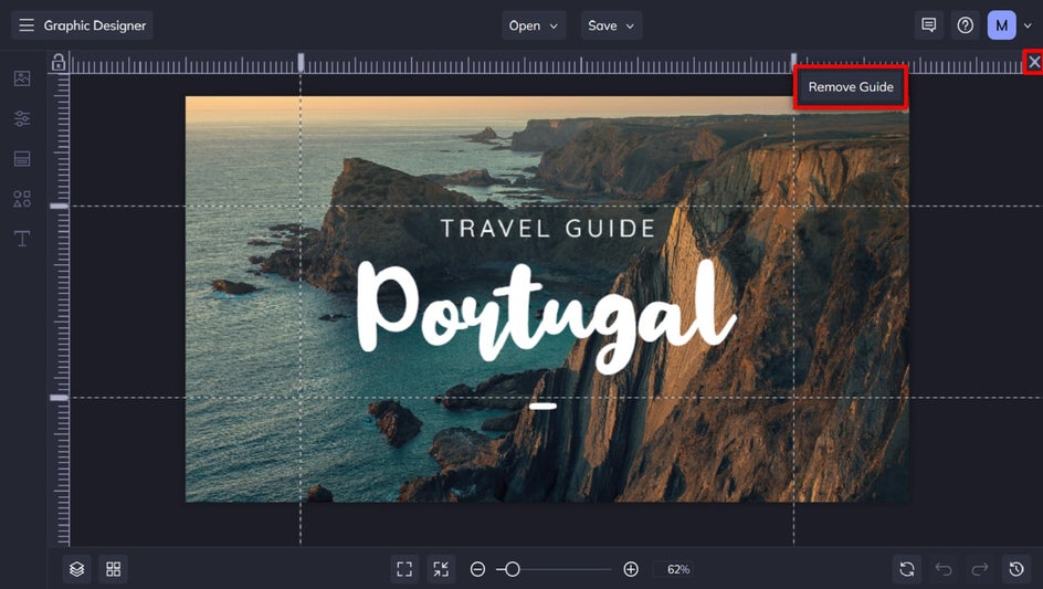 If you need to remove a guide at any point, simply right-click it and select Remove Guide from the menu that appears. To clear the guides and start over at any point, you can also click the X in the upper right corner of the canvas. This will get rid of any guides you created immediately.