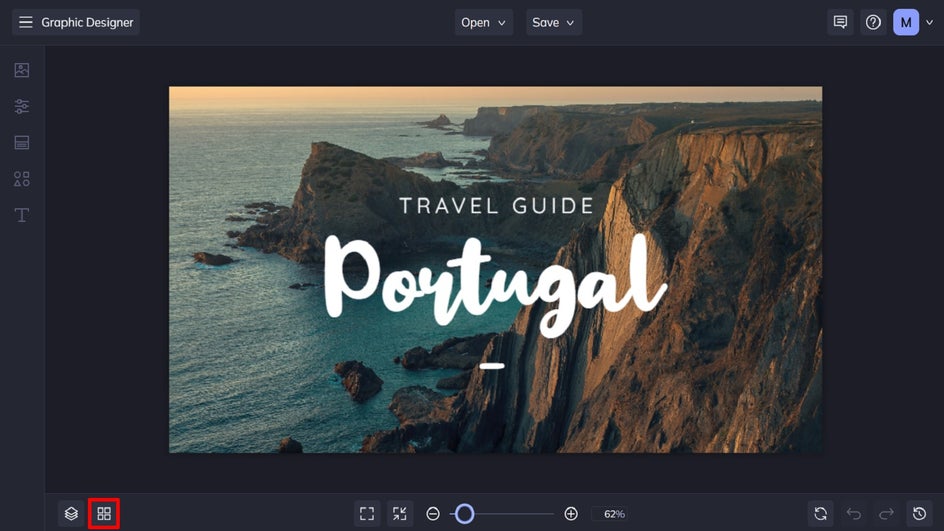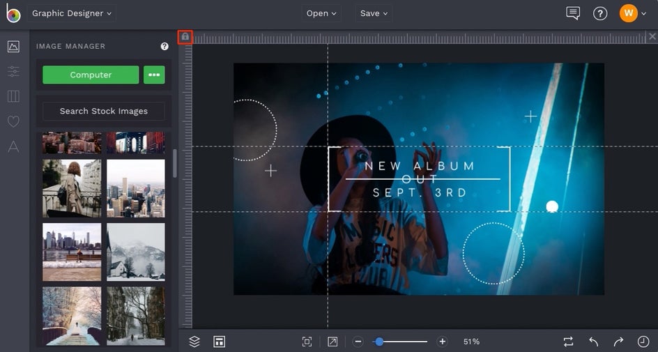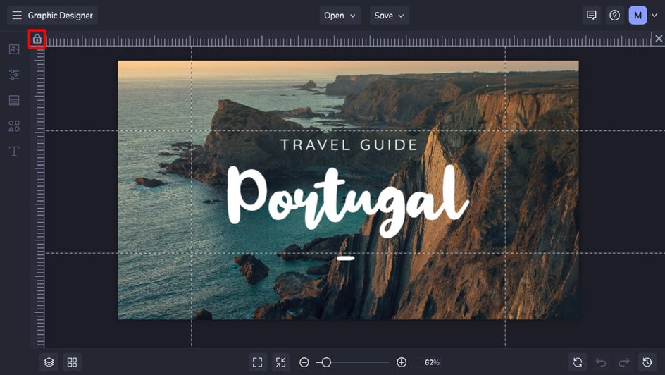 When you’ve got your guides exactly where they need to be, click the Lock icon in the upper left corner of the canvas. This will lock the guides and make them unmovable, so you can begin the design process without worrying about them shifting. If you need to adjust the guides at any point, click the lock icon again to unlock the guides, move them as needed, and click the Lock icon again.