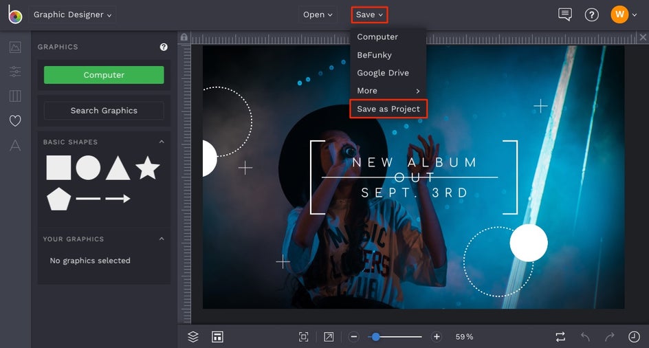 If you’re at a stopping point, but not necessarily finished with your design entirely, select the Save as Project option in the Save dropdown menu. This will save your design in editable format, so you can revisit it at any time. The best part is, the guides are saved in your editable project files, so once you reload them, you’ll see the same guides you were using to design with originally and won’t need to guess where they were!