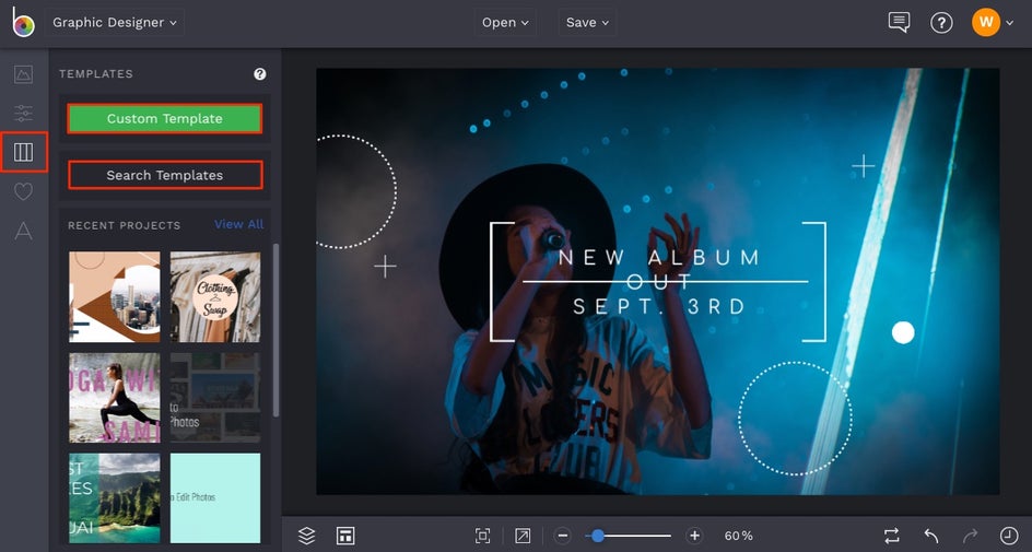 When you start a new project within the Graphic Designer, you can either begin with a blank canvas or a pre-designed template. Click on the Templates tab at the top of the page to choose a customizable design, or click Blank Canvas to start from scratch.