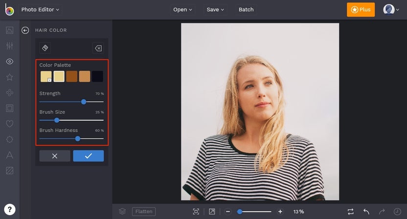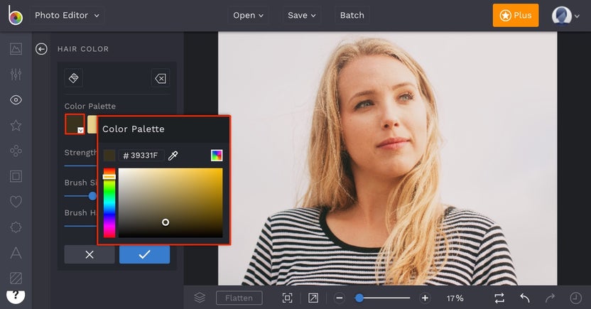 BeFunky’s online hair color changer gives you the power to try different hair colors without ever leaving your house. Use the Hair Color tool to try out a new color without committing to bleach. Or, make subtle changes to your natural color to make it pop the way you want. Try it today to give yourself a totally new look in seconds.