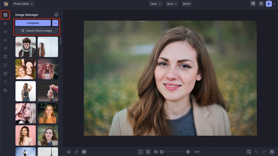 To get your images into BeFunky, head to the Photo Editor. You can either use the Image Manager to upload a photo, or drag it directly to the canvas.