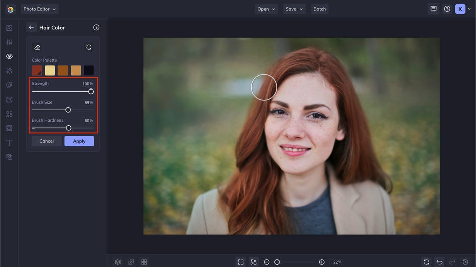 Once you have your color selected, use the settings menu to change your brush size, hardness, and the strength that you want the color applied. Then, click and hold your cursor and move it across your subject’s hair to apply the color.