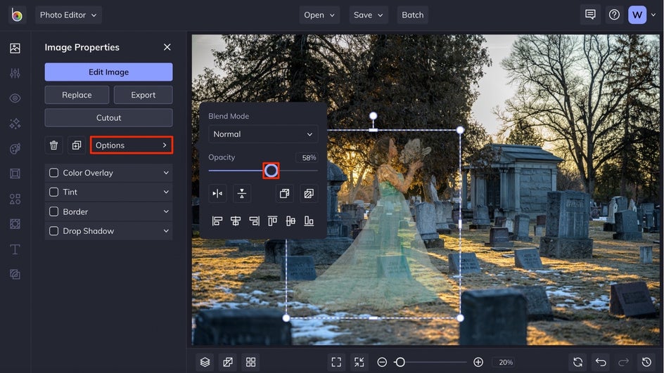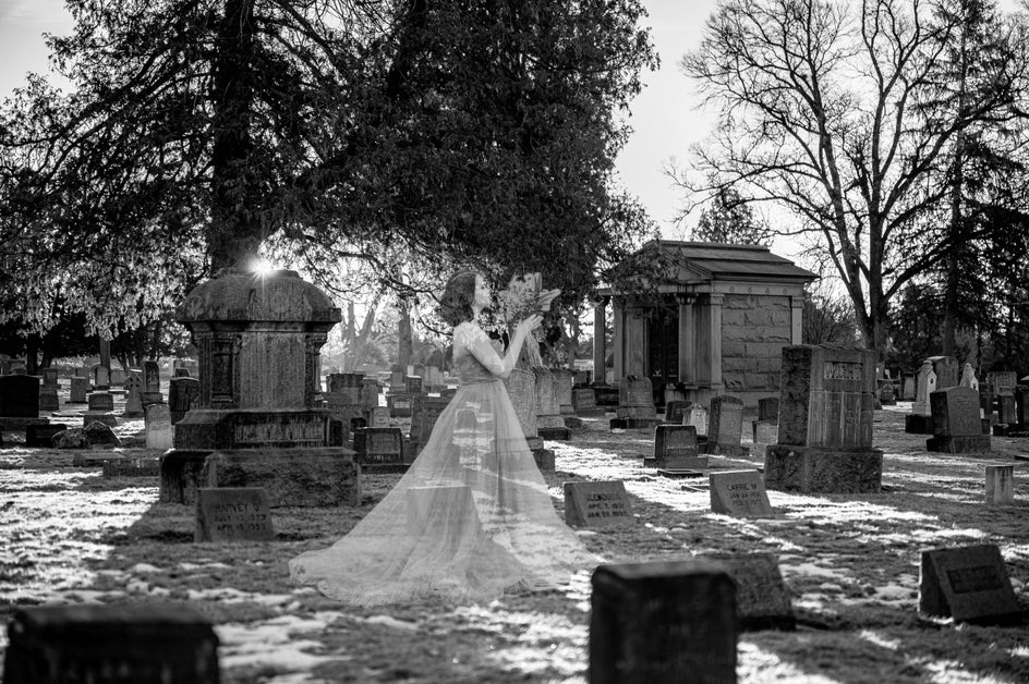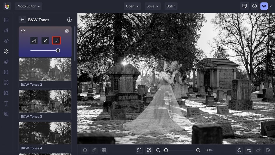 BeFunky’s Textures are ideal for giving your photos a distressed and haunted look—especially when used on vintage portraits, eerie old buildings, or spooky graveyard scenes. For the effect shown below, we started by applying the Sepia filter from the Effects tab to create an antique color tone. Then, we applied the Scratches 4 effect from the Scratches category within the Textures tab. The result? A much more chilling atmosphere that’s perfect for Halloween!