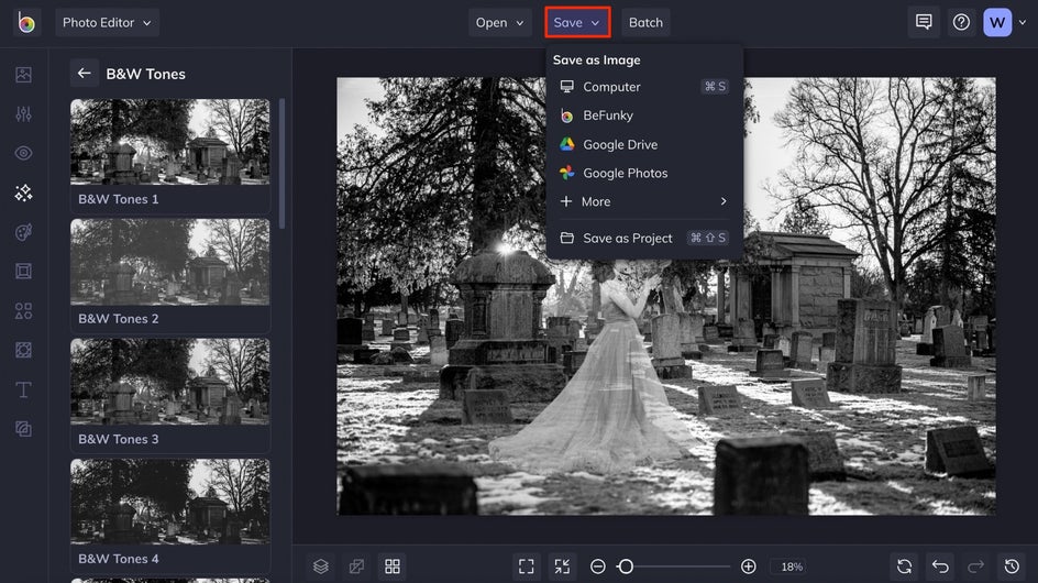 Once you’ve finished adding Halloween photo effects, it’s time to save your spooky new image. Click Save at the top of the screen, then select your desired location.