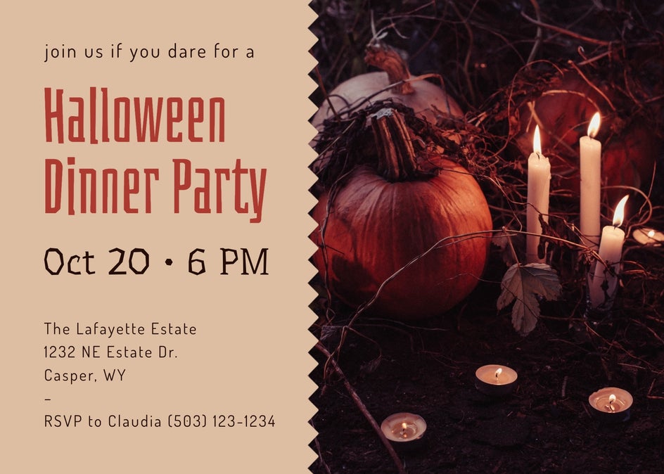 The second example features a more "grown-up" aesthetic to advertise a Halloween dinner party. While it still embraces an orange color scheme, it includes darker colors and photography for a more sophisticated aesthetic.