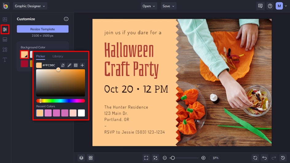 If you fancy changing the background color of your invite, you can do this by selecting Customize in the main menu and choosing one of the colored squares. You can also select a color of your choosing by clicking on the first square with the dropdown symbol on it. Find your desired shade using the Color Chart, type in its HEX Color Code, or use the Eye Dropper Tool to use a hue already present in your design.