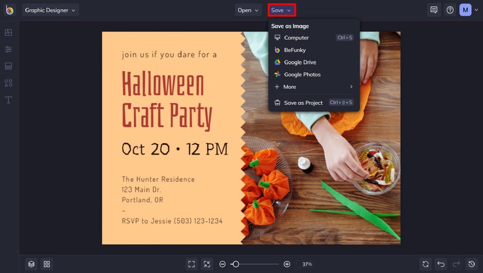 Once you’re happy with your Halloween template’s design, all that’s left to do is save it so it’s ready to share with your loved ones – either digitally or by printing it out and mailing it to them. Click Save at the top to save your work to your Computer, as well as Facebook, Dropbox, and more.