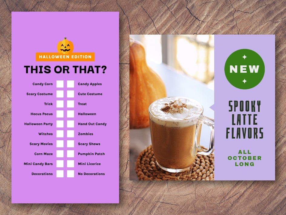 The second example features a square-shaped post that can be shared on Instagram or Facebook. It advertises a café’s spooky new latte flavors – a special offer that lasts all October long to celebrate the ghoulish holiday.