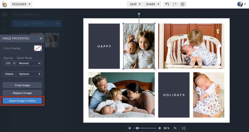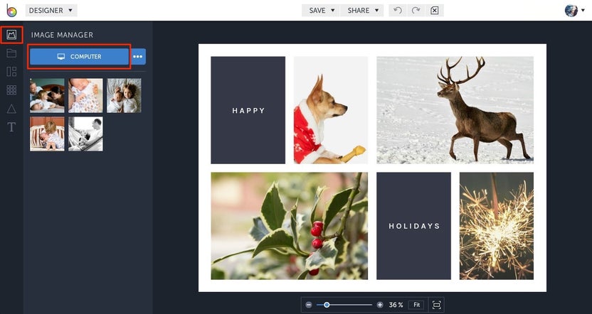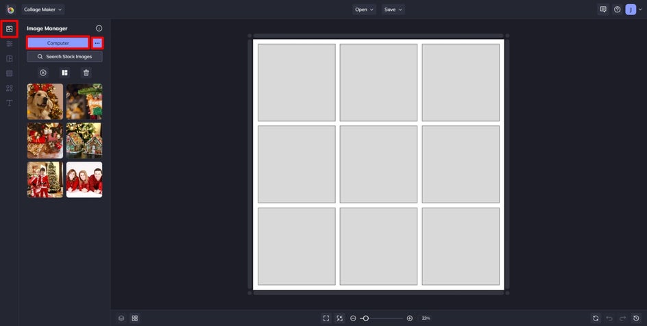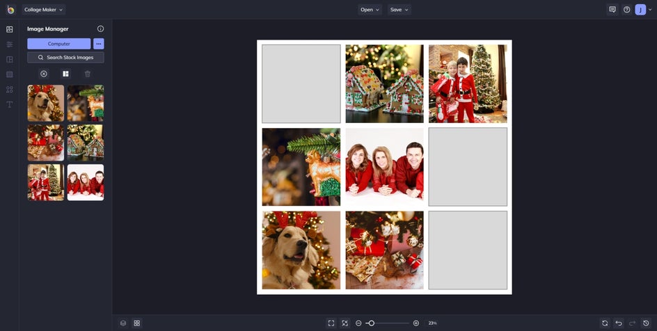 Use the Image Manager to upload your chosen photos. Drag them into the collage cells, adjust the positioning, and zoom until everything looks just right.