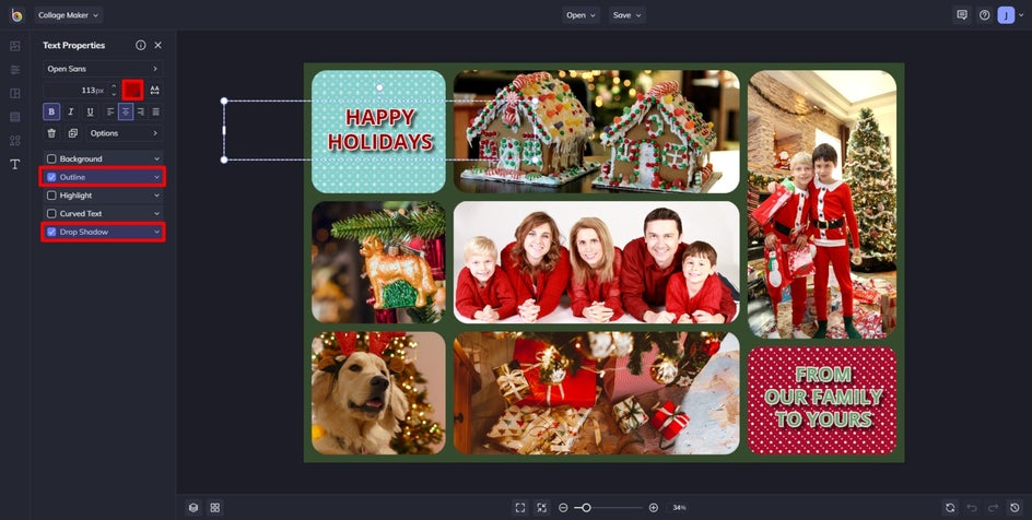 Then, head to the Text tab to add your holiday greeting. Adjust fonts and apply special text effects – such as Curved Text or Drop Shadow – to make your message stand out while balancing with the rest of your design.