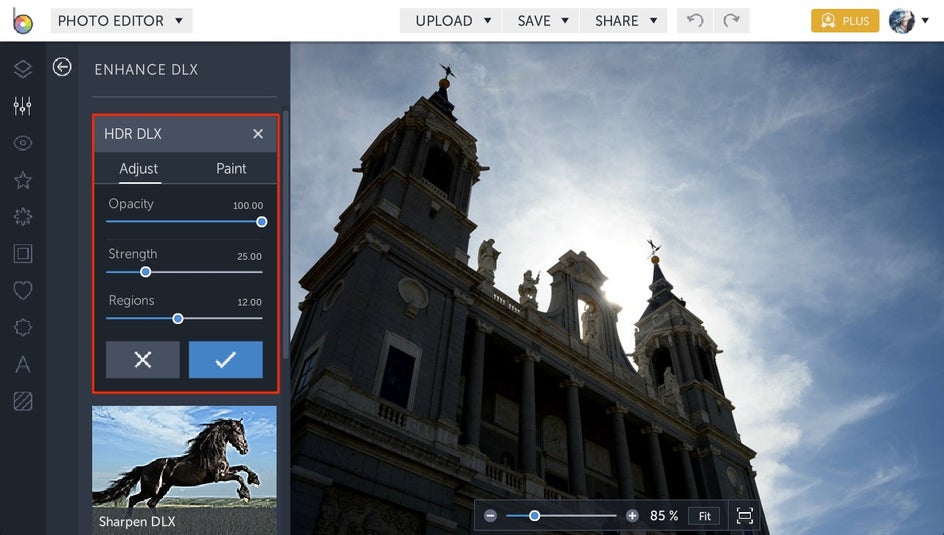 You can get even more detailed with your editing process by adjusting the Amount, Strengths, and Regions in the Adjust tab within the HDR DLX effect.