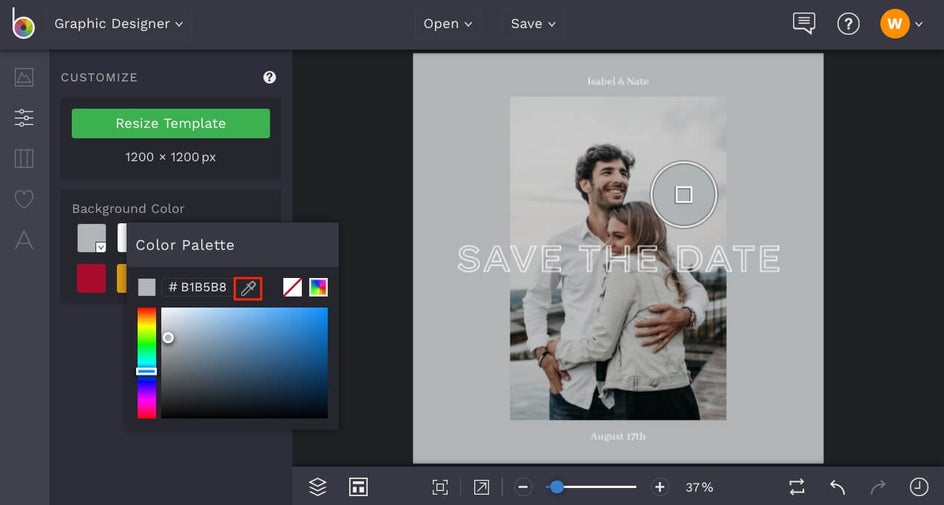In the Customize tab, select the first square under Background Color. In the menu that appears, select the Eye Dropper Tool. As you select different colors in your image, you’ll notice that the 6-digit HEX Code (located in the HEX box above the Color Palette) will change to match the color. For the color we’ve selected as the background, the HEX Color Code is #16A9F3.