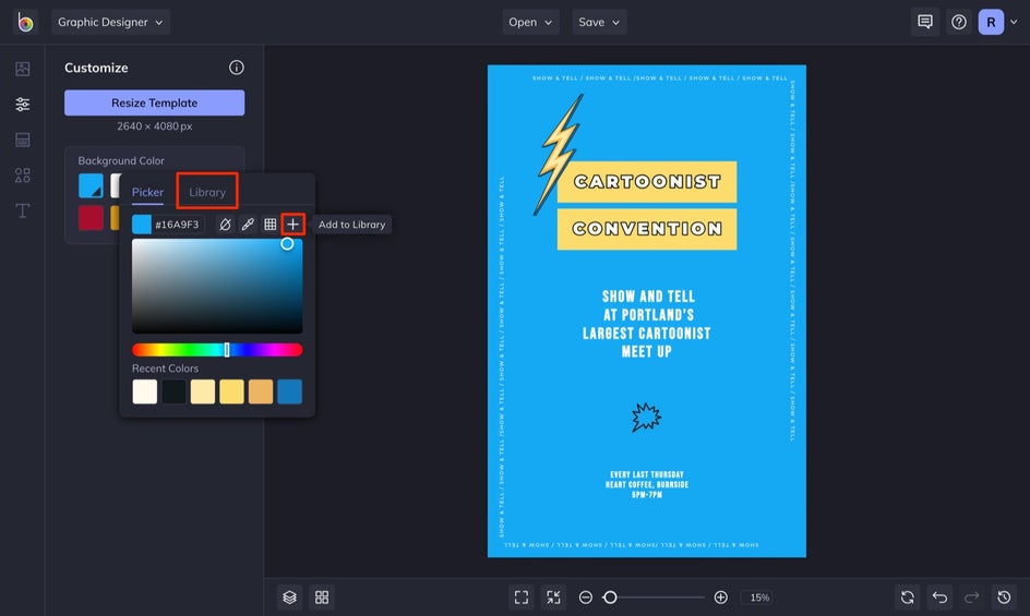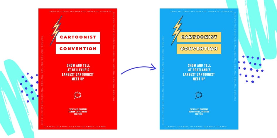 HEX Color Codes can be used throughout any part of your design, including the background, text, and graphic element color. Let’s say that you liked the design of this template but wanted the color palette to follow an old comic book you liked that was more cool-toned.
