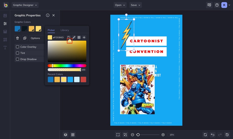 After you select the colors that you want to use, simply select a graphic element that you want to change the color of. For this, we will change the color of the lightning bolt. Because you set up your Recent Colors in Step 2, you can easily select any of these 6 colors in the Recent Colors section - so easy!
