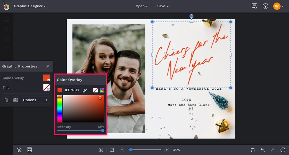 Click on any existing text to customize it using the Text tool. Personalize the main greeting or simply add your name. You can also change the font typeface and color.