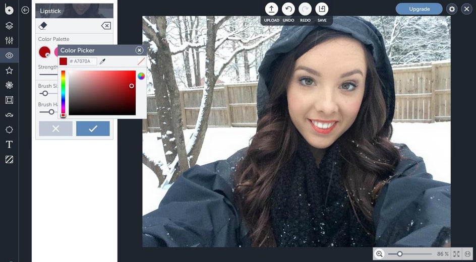 When it comes to a look that holds up in cold weather I always love the appearance of flushed cheeks. Thanks to the Blush tool in the Photo Editor I can choose the perfect pink shade to compliment my skin tone. Your blush should be applied to the apples of your cheeks, and you can adjust the strength so the color blends seamlessly onto the skin. It's also good to lower your brush hardness to give your photo a nice, soft blended effect.