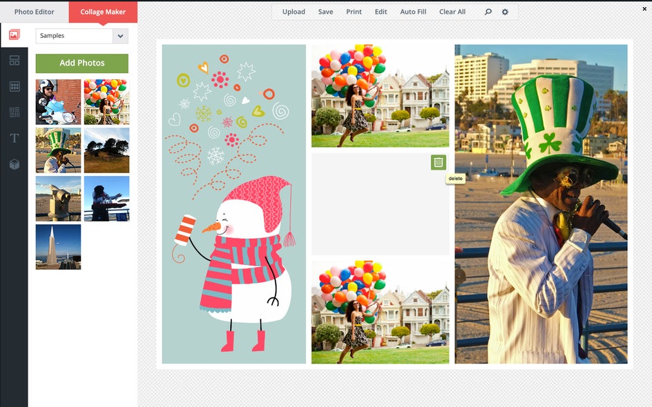 You can also change the size of the photo boxes or delete them completely. To change the size, hover over the white space between the boxes and when the blue line appears click and drag to the size you want! To delete a box, just click the box and then click the trash can icon that appears.