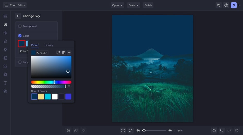 The Sky Replacer allows you to do what the name suggests – replace the sky of any photo. Our AI isolates the sky of your image and provides all of the sliders you need to achieve seamless results. This tool also includes the ability to turn the sky of your image into an opaque, uniform color. And with a small adjustment to the opacity slider, you can achieve a subtle tint effect as well. Read on to learn how to get creative with the Color category of the Sky Replacer!