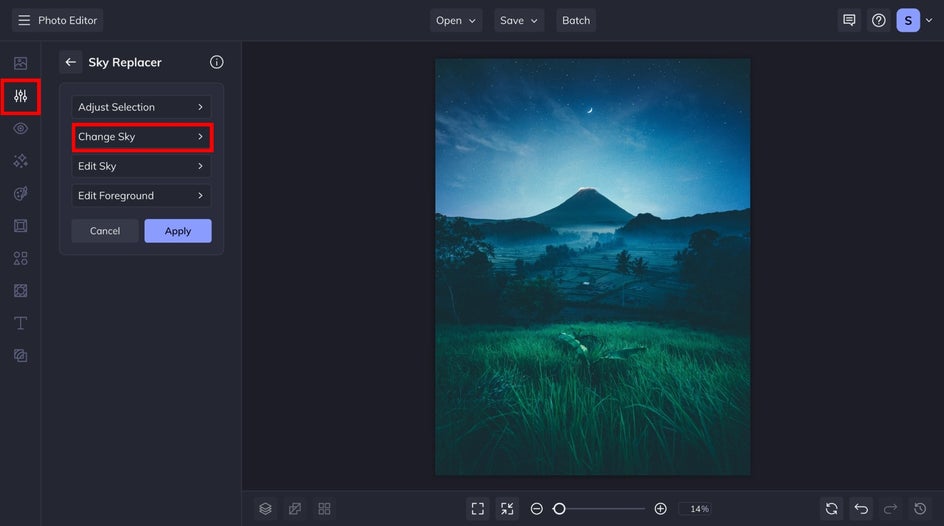 Once your image is uploaded onto the canvas, our tool will automatically isolate the sky. Head to the Adjust Selection menu if you need to make any changes to what was identified as the sky. Then, head to the Change Sky menu.