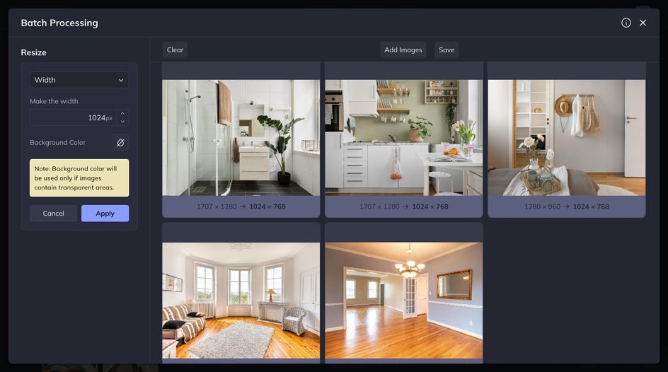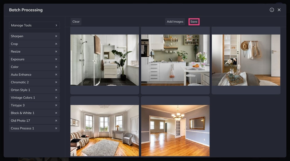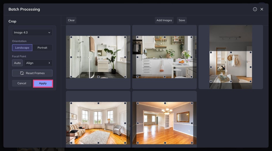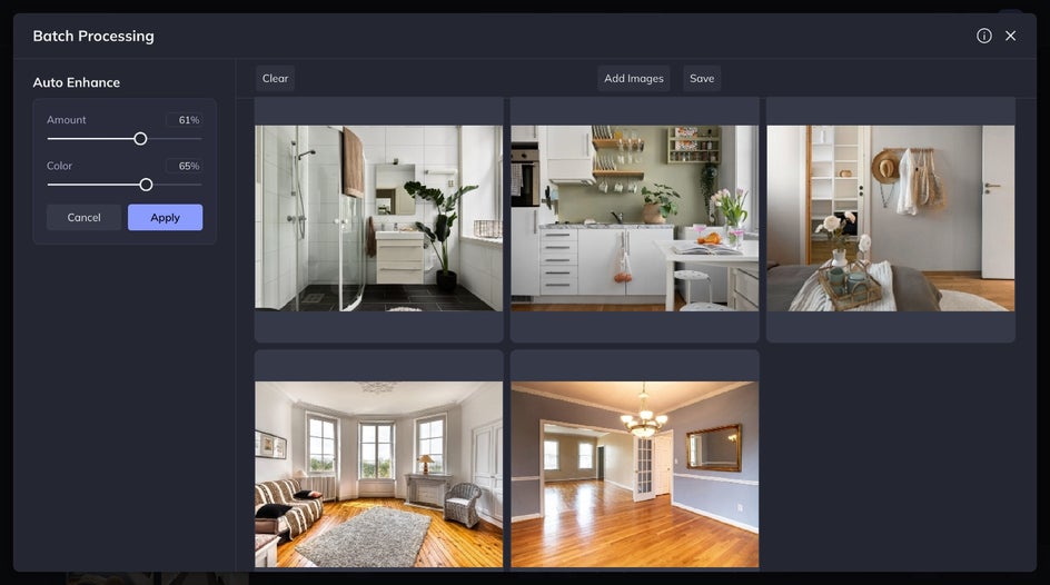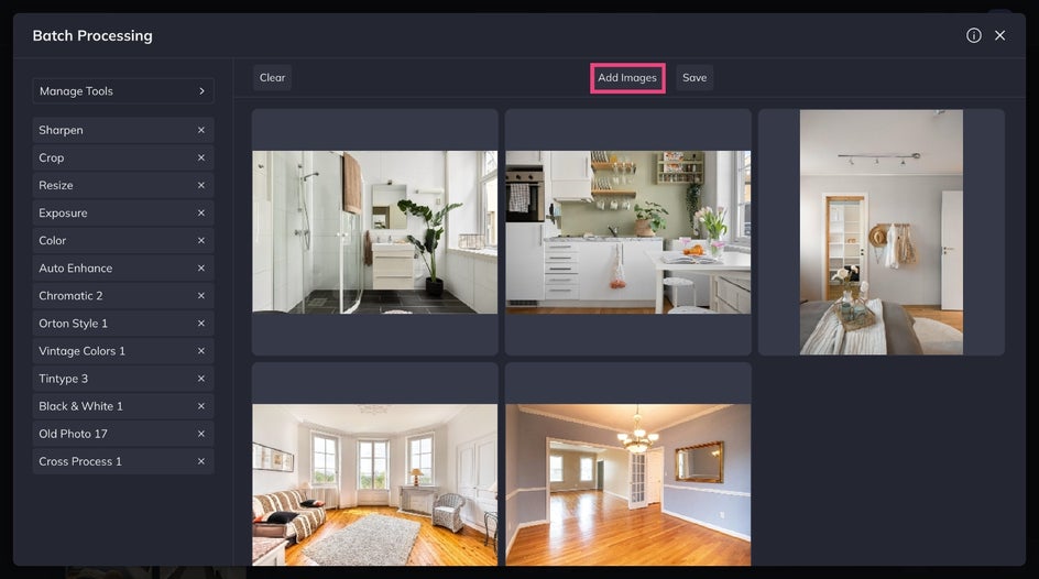 Click Add Images or simply drag and drop your photos into the Batch Editor. There’s no limit to the number of images you can upload, so whether you're editing photos for one property or ten, you can work on them all at once.