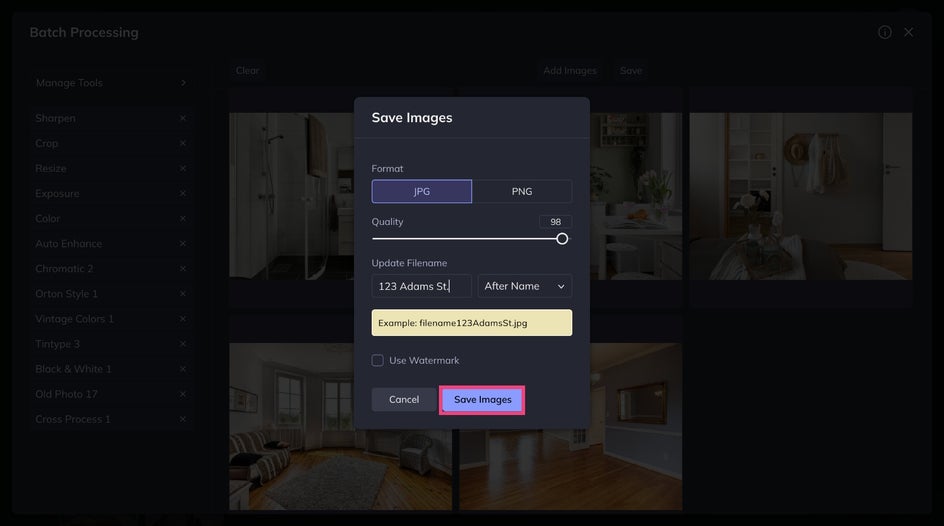 Choose your format and adjust the quality settings based on how you want to share your real estate photos. Use the filename editor to batch label your images (e.g., “MainStreet_Kitchen1”) for easy filing.