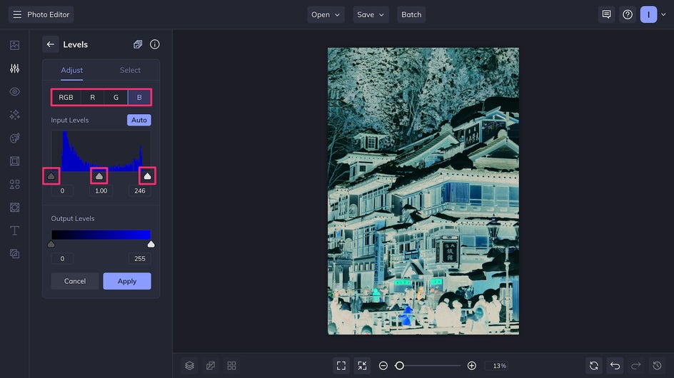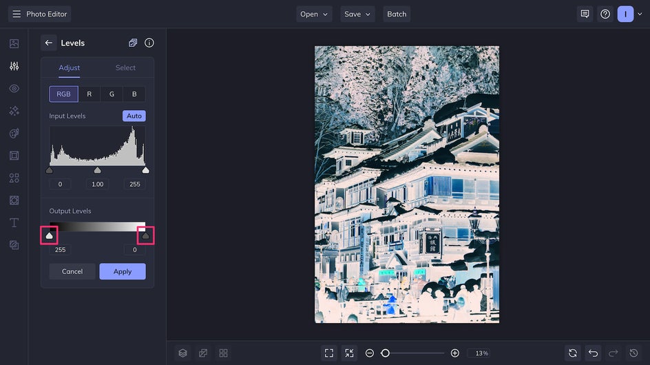 Unlike the Negative effect, which only allows you to turn certain RGB color channels on or off, the Levels tool allows you to customize one step further with adjustment sliders. This means you can finetune the colors, shadows, and highlights of your newly inverted photo. Switch between Red, Green, Blue, and RGB to adjust each color channel individually or all of them at once.