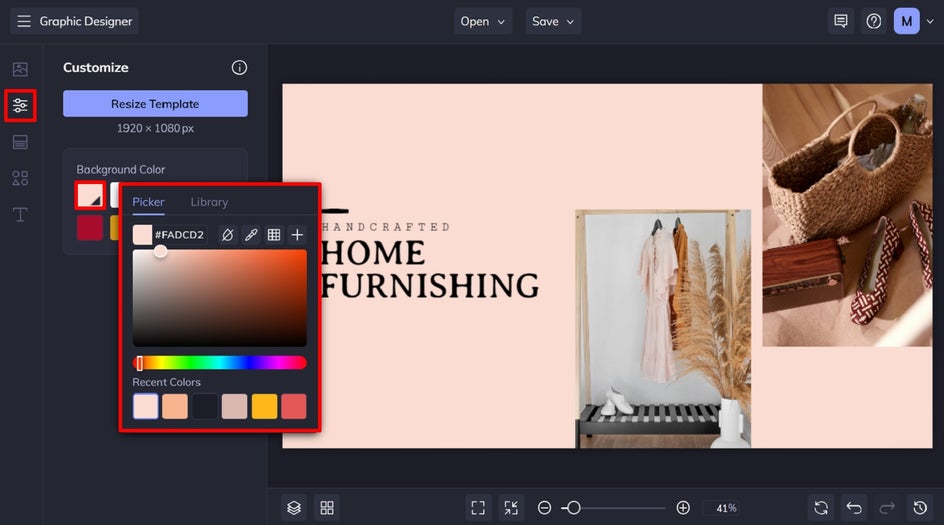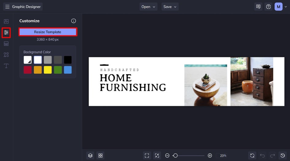First, let’s resize our chosen banner to be perfect for Poshmark’s desired dimensions. Click on Customize in the main menu on the left, followed by Resize Template. Use 1920x1080 pixels as your new dimensions, then click Resize.