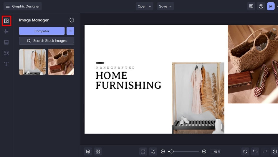 You’ll then want to choose imagery that reflects your shop’s aesthetic. To swap out your Poshmark banner template’s existing imagery, simply navigate to the Image Manager in the main menu on the left. Then, upload your preferred image from your computer, BeFunky account, Google Photos, Google Drive, or our Stock Image Library. Then, just drag and drop your new image onto the template’s existing image that you wish to change.