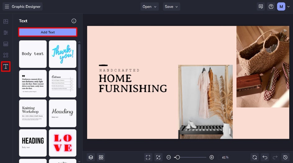 To add text, click on Text in the main menu, followed by Add Text. Alternatively, you can select one of our curated text patches.