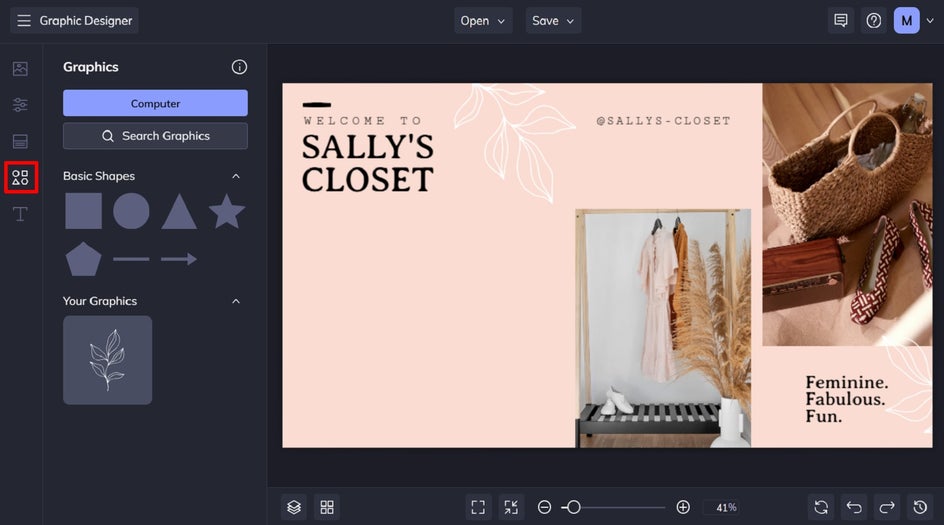 You can also enhance your design with graphics, shapes, or icons from our extensive Graphics Library. Click on Graphics in the main menu on the left, followed by Search Graphics.
