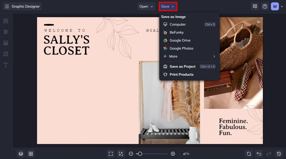Once you’re happy with your Poshmark banner design, click Save and download your banner as a high-quality JPEG or PNG file. Then, head to Poshmark, go to your profile, and upload your new header!