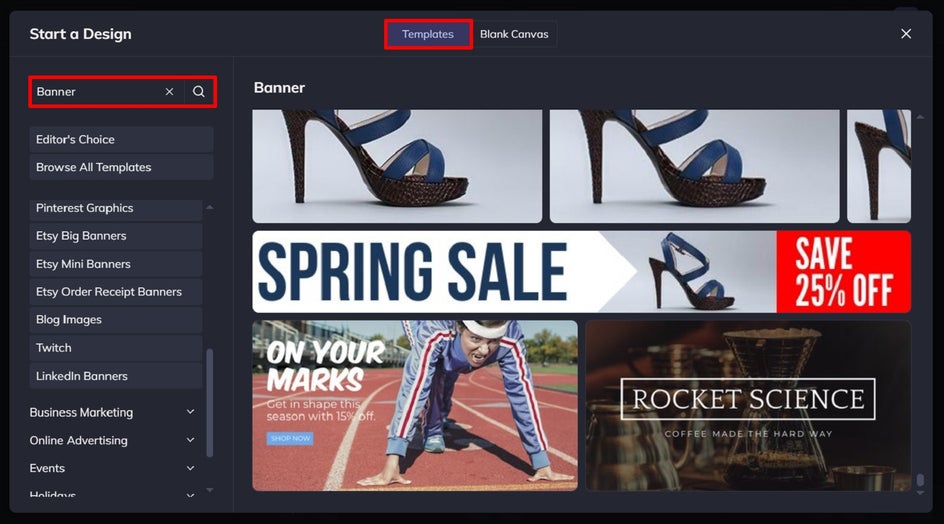 Ready to try our Poshmark banner maker for yourself? Head to our Graphic Designer’s Template library and search for “banner” to find a template that works for you. Then, just follow these 5 steps below!
