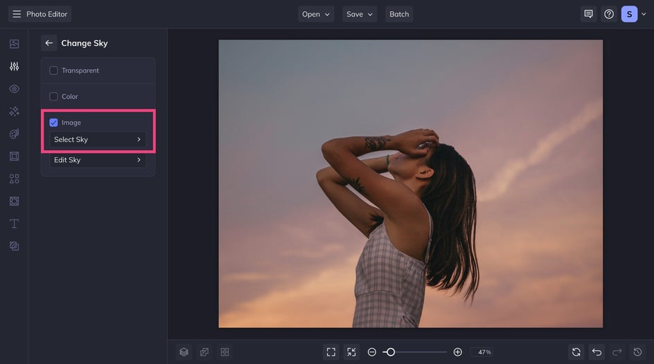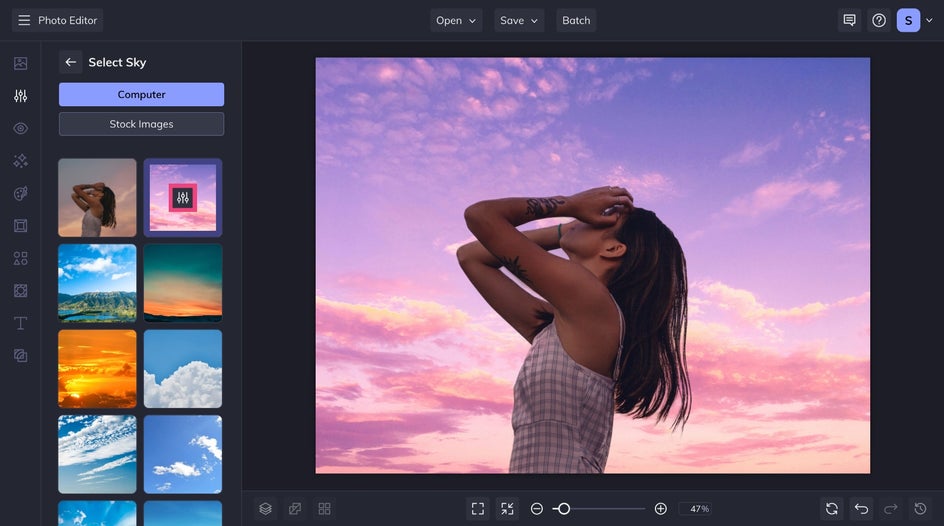 Next, click on Image and choose Select Sky to browse BeFunky’s collection of skies – or upload your own.
