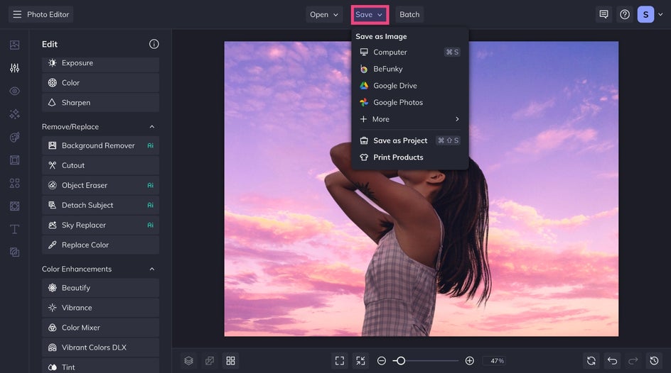 Click Save at the top of the screen and choose your destination. Your photo is now ready to share, print, or add to your portfolio.