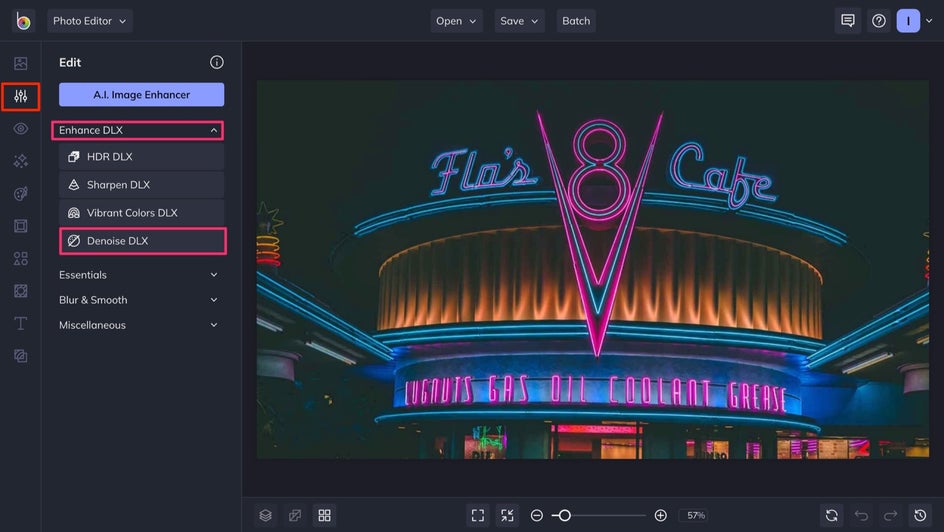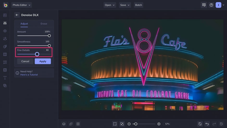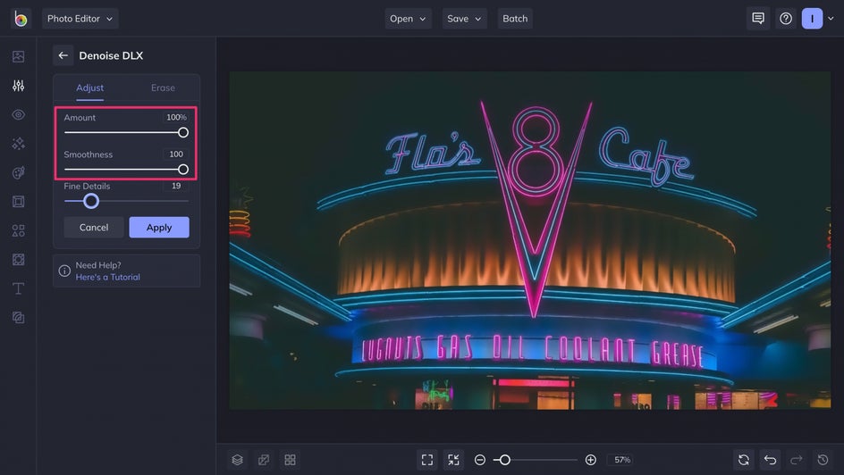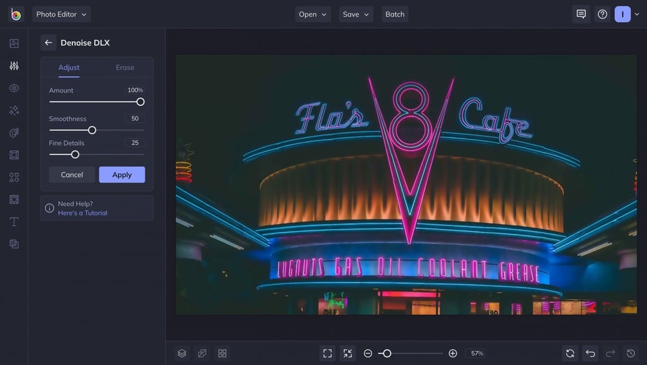 Whether you want to clean up some stray pixels that can only be seen once you zoom in, or you’re trying to salvage a grainy photo with obvious noise, our Denoise tool can clear up and brighten any image immediately.