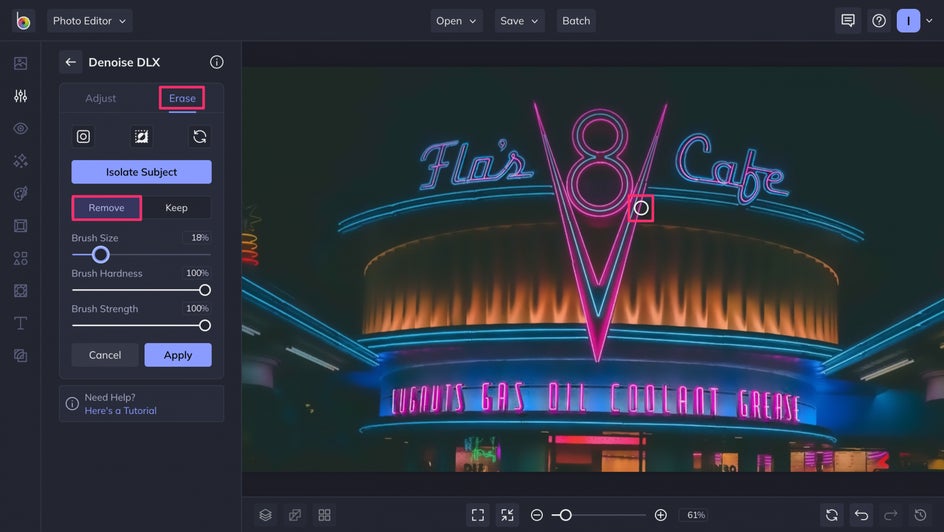 To use A.I. to smooth out the pixels in your photo and get rid of noisy areas, just adjust the Denoise slider to the level you’d like and click Apply! It’s as easy as that.