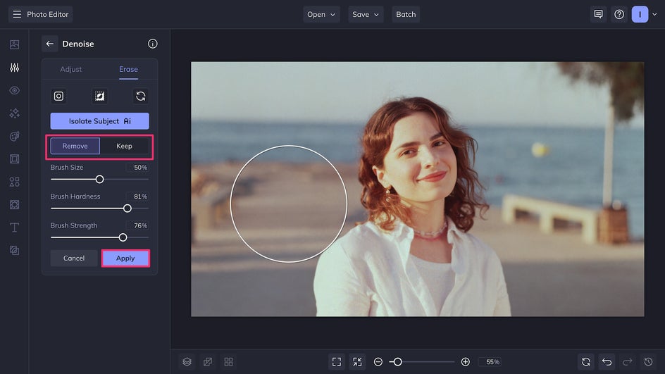 With the new A.I. Denoise tool, you can control the intensity of the effect, but everything else is left up to the A.I., making it super convenient! However, if you want more control over your denoising, you can also use the Erase tool to bring back some texture to areas where the smoothing looks too harsh. If you accidentally erase too much, just switch from the Remove tool to the Keep tool.