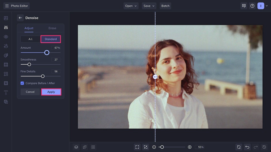 Another option that allows for greater customization is the Denoise Standard mode. This enables you to adjust the detail level and smoothness of your photo. (Note: Standard mode does not include the Face Recovery feature.)
