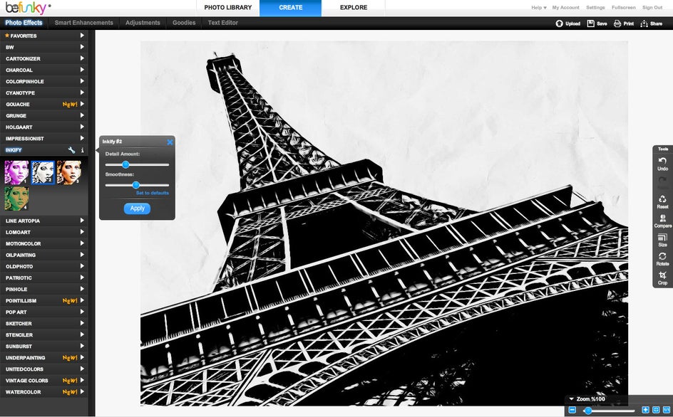 To get your ink photo effect just right, try playing with the advanced settings. To reveal them, bring your mouse pointer to the left side of your screen. If the effects panel doesn't show up, just to click the wrench icon above the presets. From the popup, you'll be able to adjust things like detail amount and smoothness of the sketch.