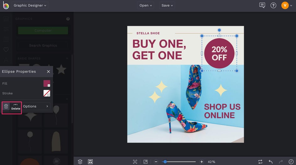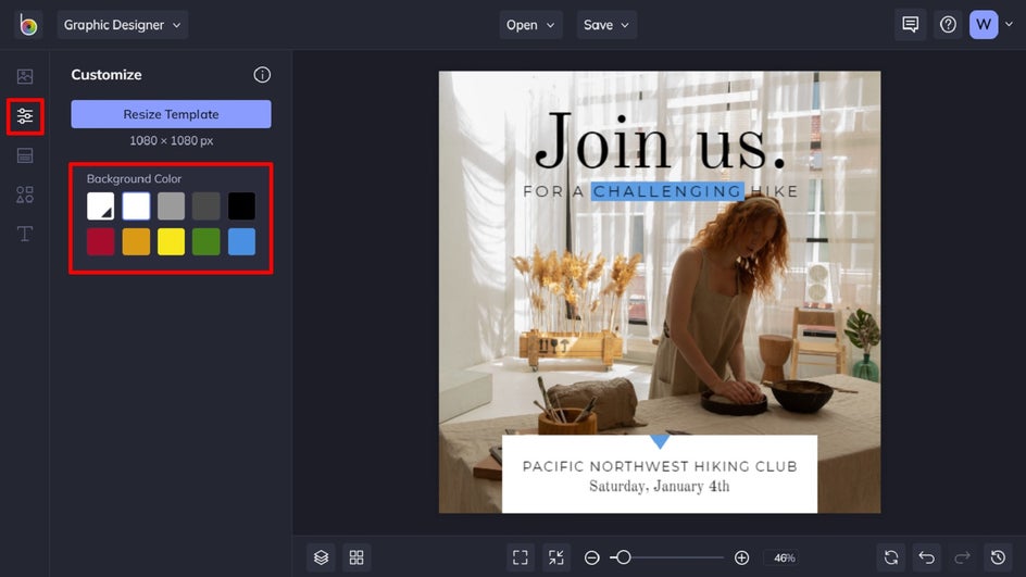 Customize your template by clicking on any element. Want to swap in your own product photo? Upload one from your computer in the Image Manager. Personalize text and adjust colors to reflect your brand. You can also play with fonts, graphics, and textures for a more custom look. If any of your images look like they could use an extra boost, click on them to access the in-platform Photo Editor.