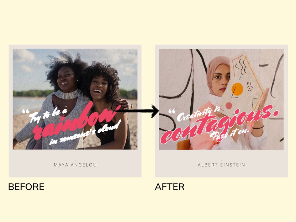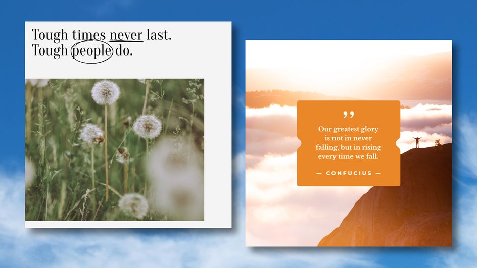 Motivating, affirming, or clever quotes are a surefire way to spark engagement. These posts tend to get shared often, especially when paired with relevant visuals, quirky memes, or beautiful typography. Use the text box to drop in a favorite quote and pair with a dramatic stock photo, interesting texture, or brand image. If you’re a brand manager, this is a simple way to keep content fresh between major announcements or launches. If you’re an influencer or creative, this is a great way to share your own thoughts or your favorite inspirational quotes.